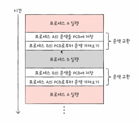 기존 프로세스의 문맥을 PCB에 백업하고, 새로운 프로세스를 실행하기 위해 문맥을 PCB로부터 복구하여 새로운 프로세스를 실행하는 것이 문맥 교환